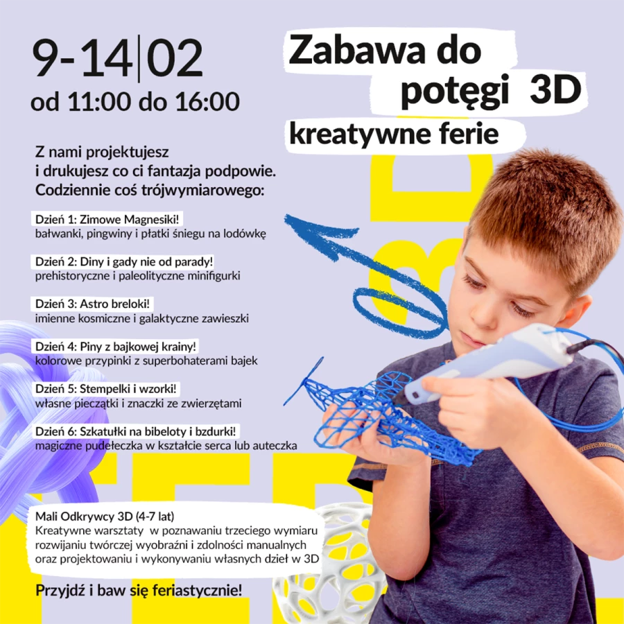 Od 9 do 14 lutego zapraszamy dzieci na codzienne warsztaty 3D pełne projektowania, drukowania i twórczej zabawy. Każdego dnia nowy temat, nowe pomysły i własnoręcznie wykonane trójwymiarowe prace. Ferie pełne wyobraźni, technologii i świetnej zabawy dla małych odkrywców!