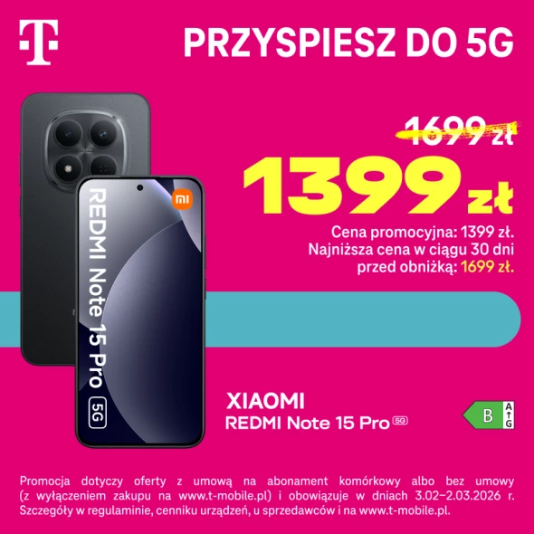 Teraz XIAOMI REDMI Note 15 Pro 5G w cenie 1.399 zł. Promocja dotyczy oferty z umową na abonament komórkowy albo bez umowy (z wyłączeniem zakupu na www.t-mobile.pl) i obowiązuje w dniach 3.02 -2.03.2026r. Szczegóły w regulaminie, cenniku urządzeń, u sprzedawców i na www.t-mobile.pl.