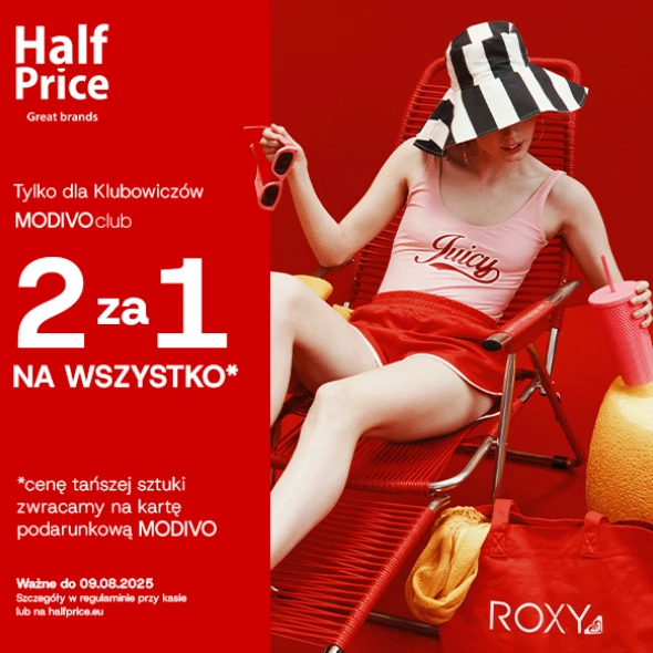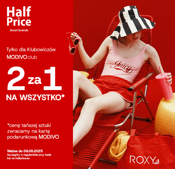 W HalfPrice trwa akcja 2 za 1 na wszystko – kup dwa produkty z ABSOLUTNIE CAŁEJ oferty, a wartość tańszego z nich wróci do Ciebie na kartę podarunkową MODIVO.
