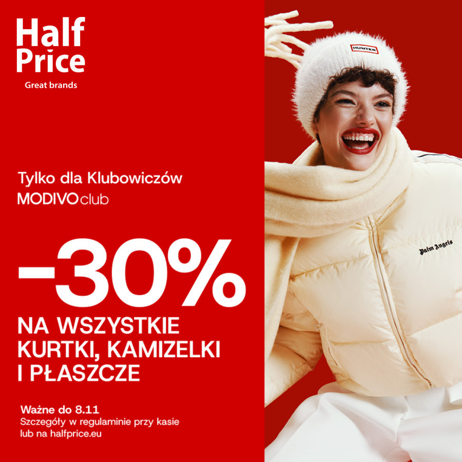 W HalfPrice wszystkie kurtki od światowych marek tańsze o 30%! Nie czekaj, aż zrobi się naprawdę chłodno! Wpadnij do HalfPrice i wybierz ulubiony model w wyjątkowej cenie. Oferta tylko dla Klubowiczów MODIVOclub, ważna do 8 listopada. Nie jesteś jeszcze w klubie? Dołącz i też zyskaj rabat! Szczegóły w regulaminie przy kasie i na halfprice.eu. HalfPrice. Great brands.